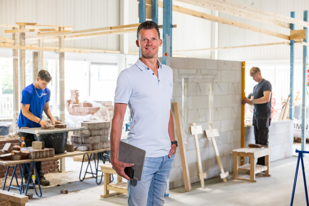 Wouter de Vries weet hoe het is om te leren met je handen. Hij begon ooit als leerling bij Bouwmensen Apeldoorn, werkte jarenlang als timmerman en stond vijf jaar als instructeur in de werkplaats. Nu is hij leerlingbegeleider: de schakel tussen leerling, school en leerbedrijf. “Ik ben echt van de praktijk, net als veel van onze leerlingen”.