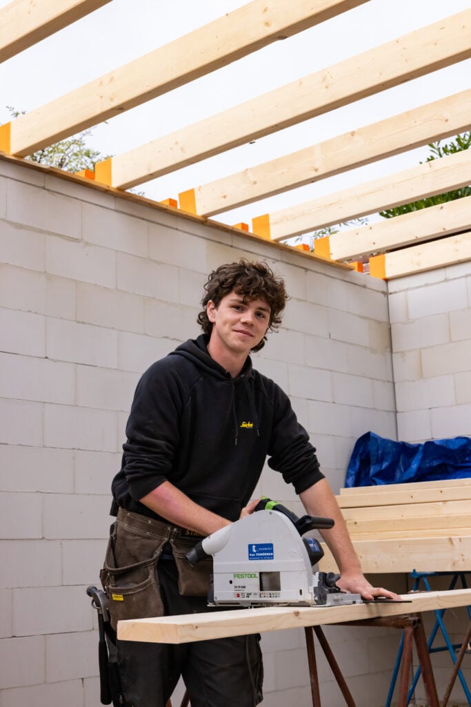 Melvin wist al vroeg dat hij de bouw in wilde. Zijn vader is timmerman met een eigen bedrijf, en als kind liep hij al rond op de bouw. Via school hoorde hij over Bouwmensen Apeldoorn en ROC Aventus. Na de open dag en de Kickstart was hij overtuigd. “Ik voelde me meteen welkom. Je wordt hier echt in de armen gesloten”.